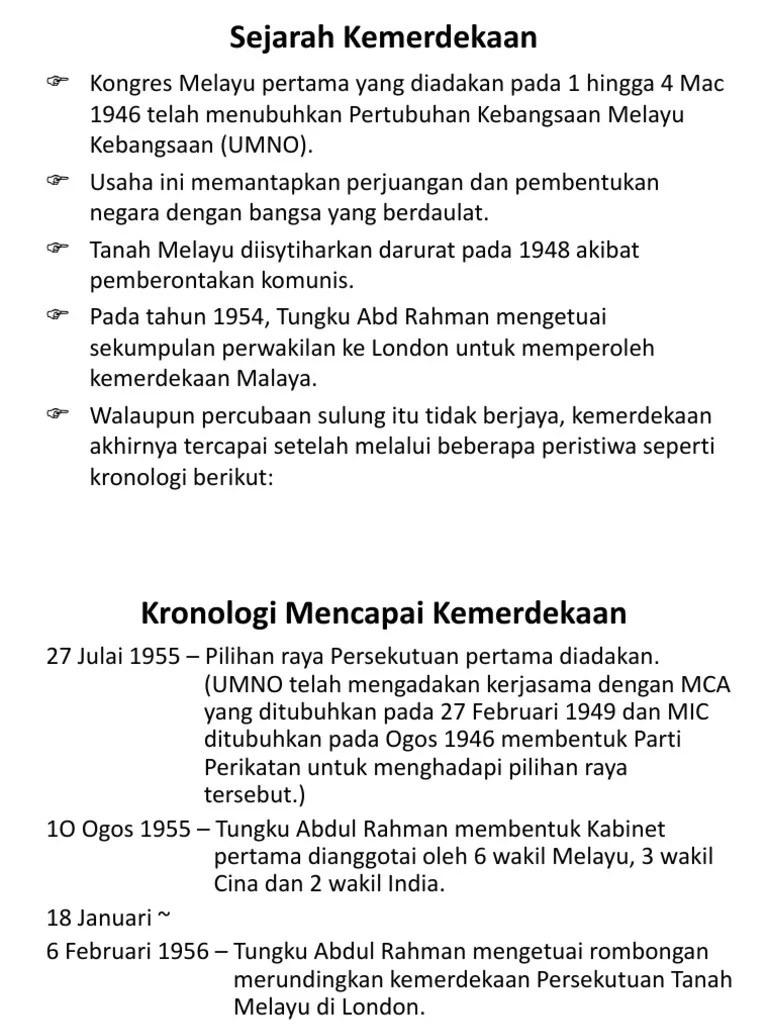 Kronologi mencapai kemerdekaan 27 julai 1955 pilihan raya persekutuan pertama diadakan. Kemerdekaan negara pada 31 ogos 1957 (5 safar 1377 hijrah) merupakan peristiwa. Tunku telah membuat pengisytiharan kemerdekaan persekutuan tanah.